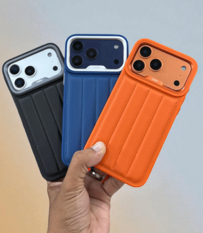 iPhone 17 Pro Max Kajsa Leather Puffer Case Luxury Soft Cushion Protective Back Cover in Black, Blue & Orange (Design 1)