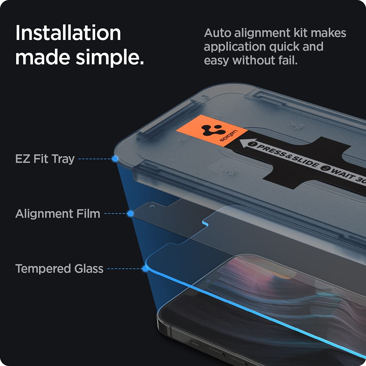 Apple iPhone 13 Pro Max EZ Fit Protector by Spigen comes with 2 Protectors & a very easy to use application method leaving no room for bubbles.
