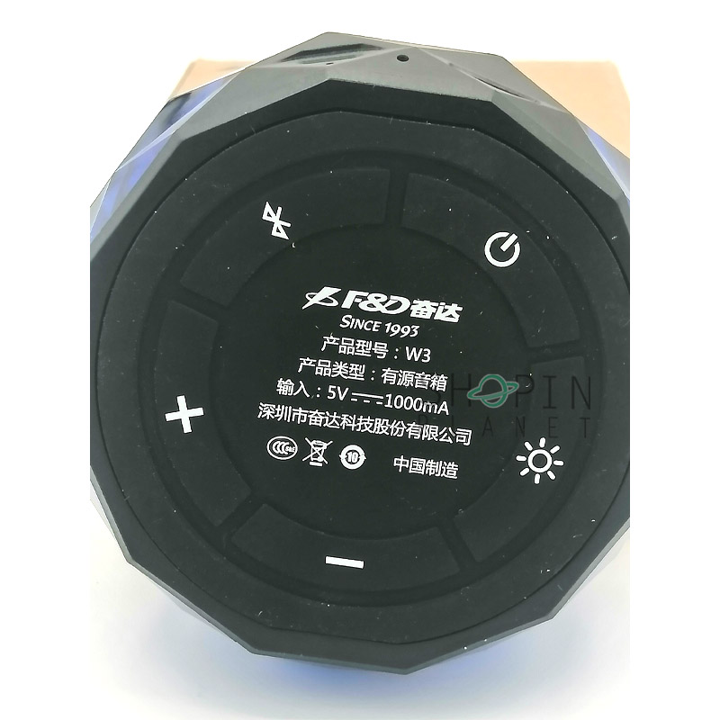 F&D W3 portable bluetooth speaker has bluetooth v4.0, 3W RMS, 3W power output, 5V — 1000mA power input, 80Hz – 20KHz frequency response, ≥75dB separation, ≥75dB S/N ratio, micro SD card slot.