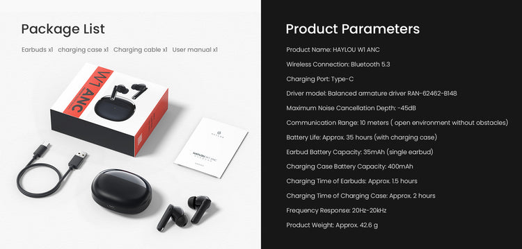 W1 ANC provides up to 6.5 hours of continuous playback of your favorite music and 35 hours of total playtime when combined with the charging case. Never worry about running out of battery again!